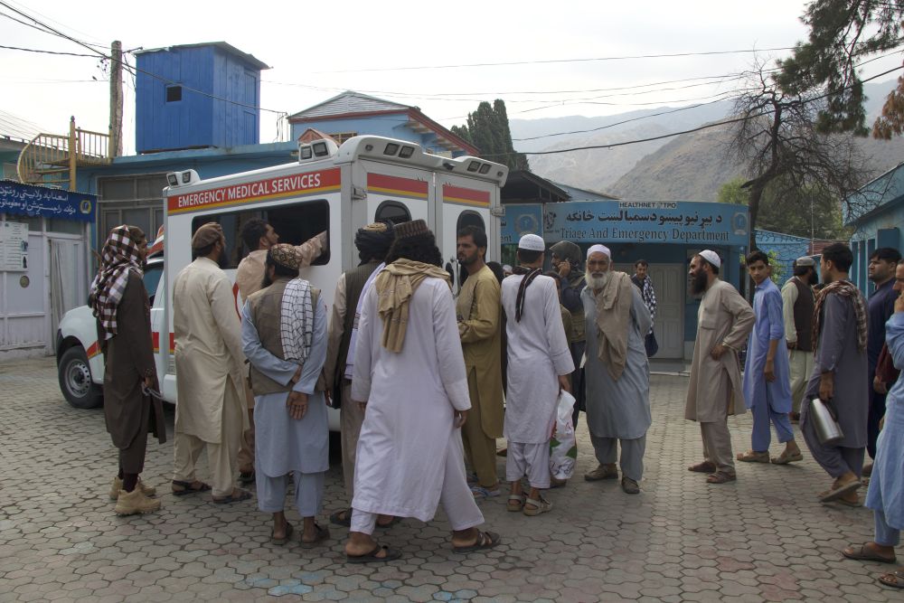 9月1日,在阿富汗库纳尔省中心医院,人们聚集在救护车旁。新华社发(卡扎菲摄)